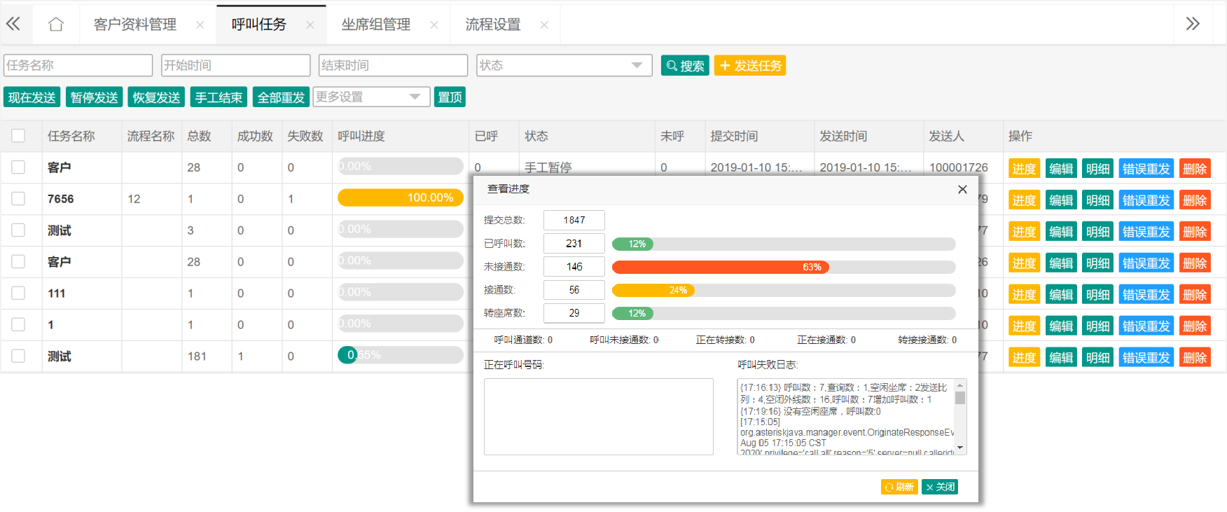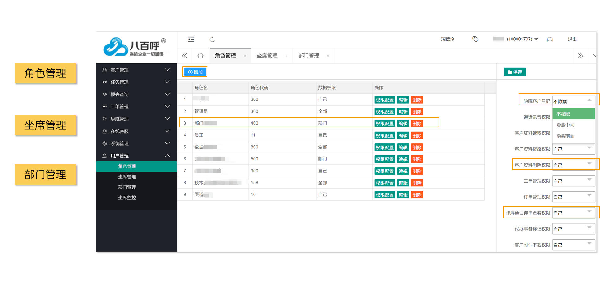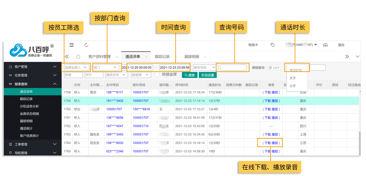 按座席、部门、时间等多维度查询员工通话明细、录音等