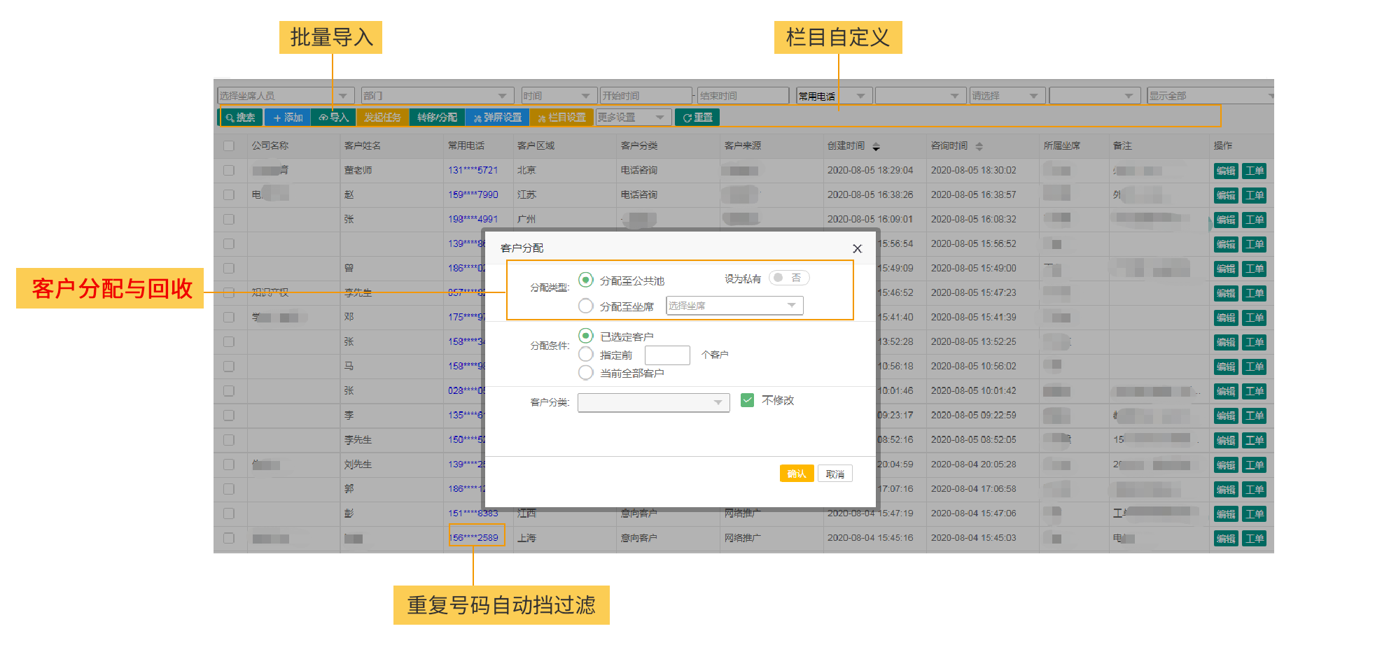 多渠道客户资料批量导入,自动过滤重复号码,统一管理