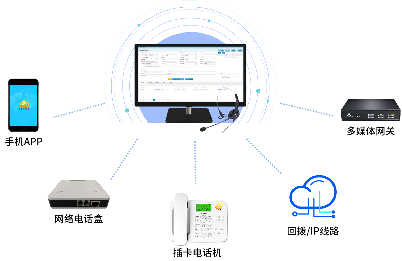 直接使用手机APP,同时兼容座机、手机卡、SIP线路等多种模式,呼叫系统功能模块自由组合