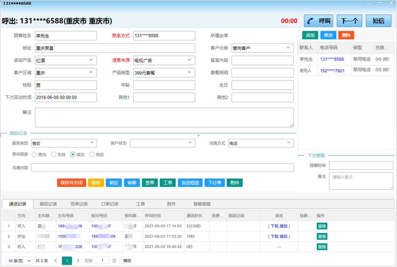 座席根据分配的号码一键拨号,完善客户资料,填写跟进记录